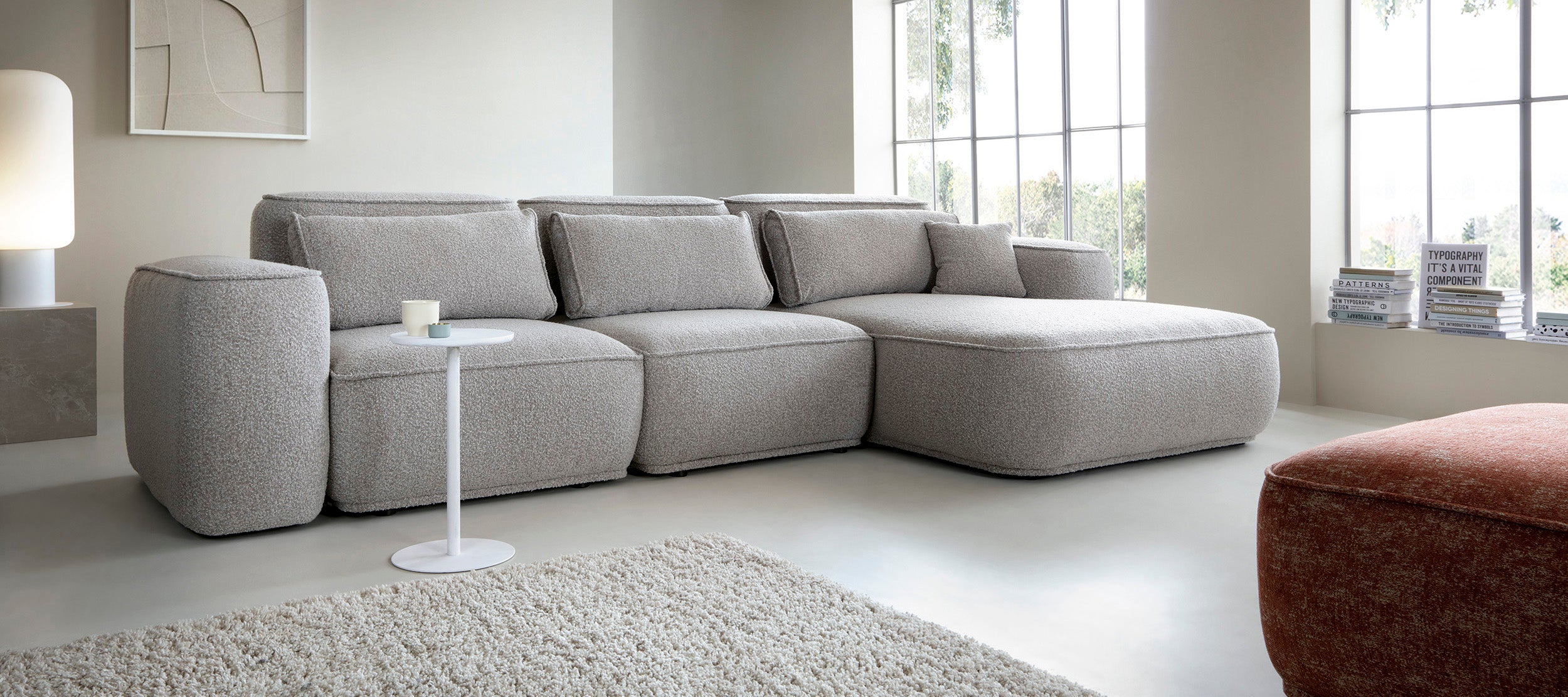 Narożnik Buffalo to idealne połączenie nowoczesnego wzornictwa i komfortu użytkowania. Jego masywna, ale zarazem miękka forma przyciąga wzrok i tworzy przytulną strefę relaksu w każdym salonie. Obicie z tkaniny bouclé nadaje narożnikowi Buffalo elegancki, przyjemny w dotyku charakter, który podkreśla wyjątkowość tego mebla.