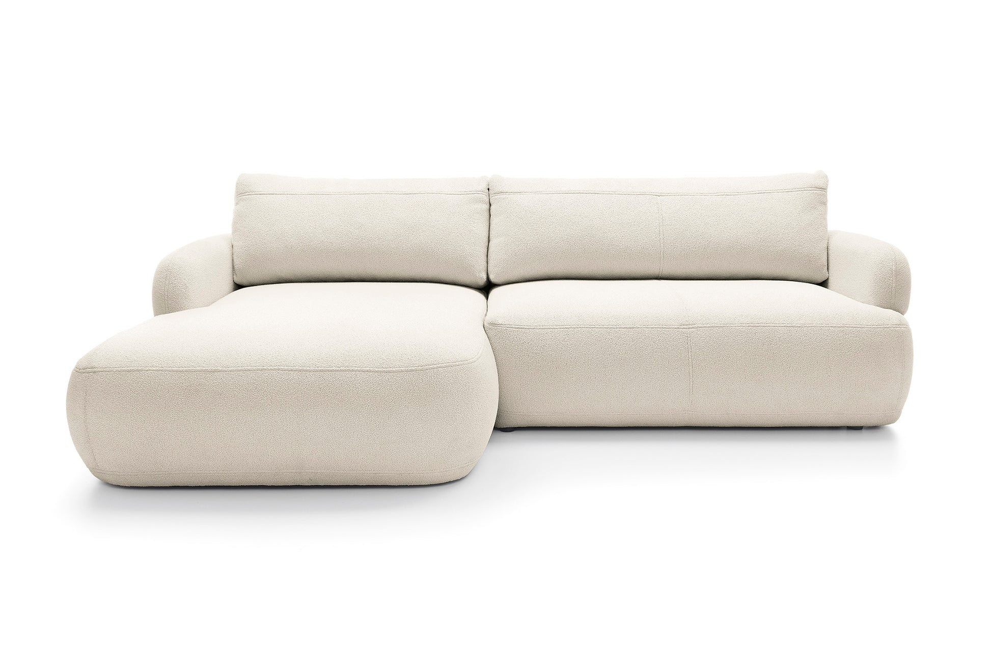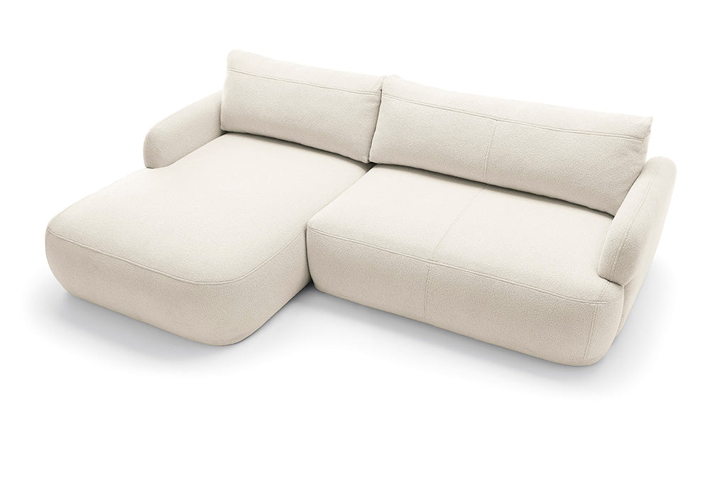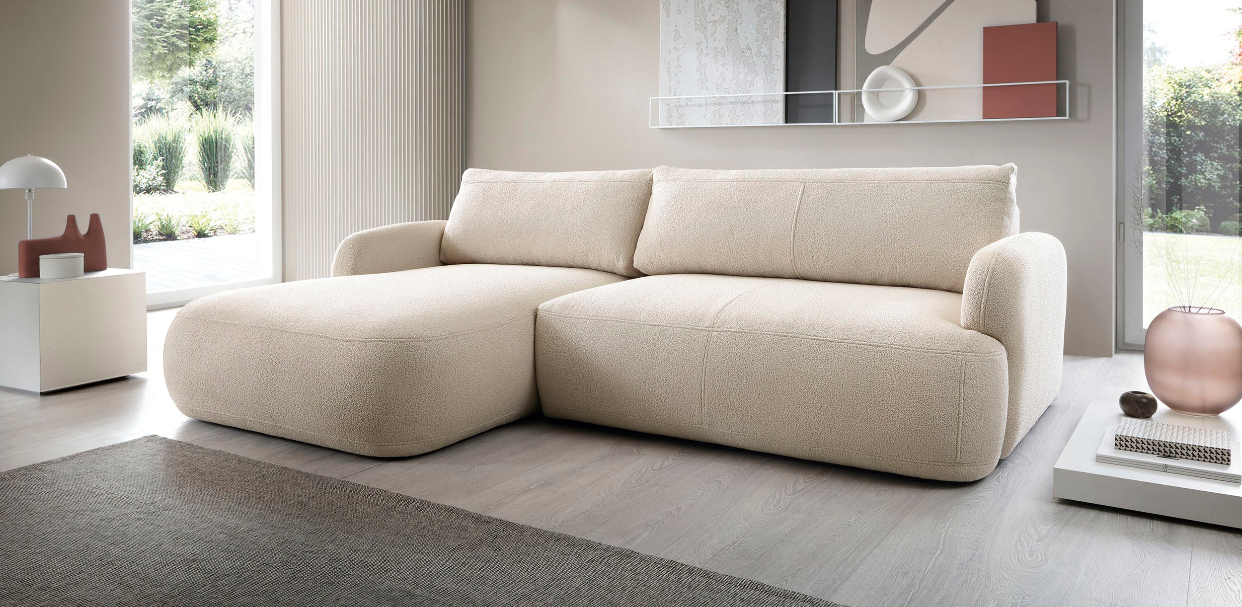 Sofa narożna SABA to mebel, który wnosi do wnętrza miękkość i spokój. Jej zaokrąglone kształty, brak widocznych nóżek i jednolita tkanina tworzą harmonijną całość, idealną do nowoczesnych przestrzeni.